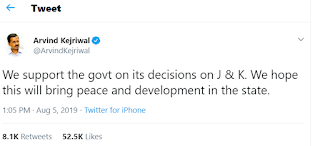 Delhi chief Minister Arvind Kejriwal  also support Modi govt. decision to remove the special status of J&K and twitted: